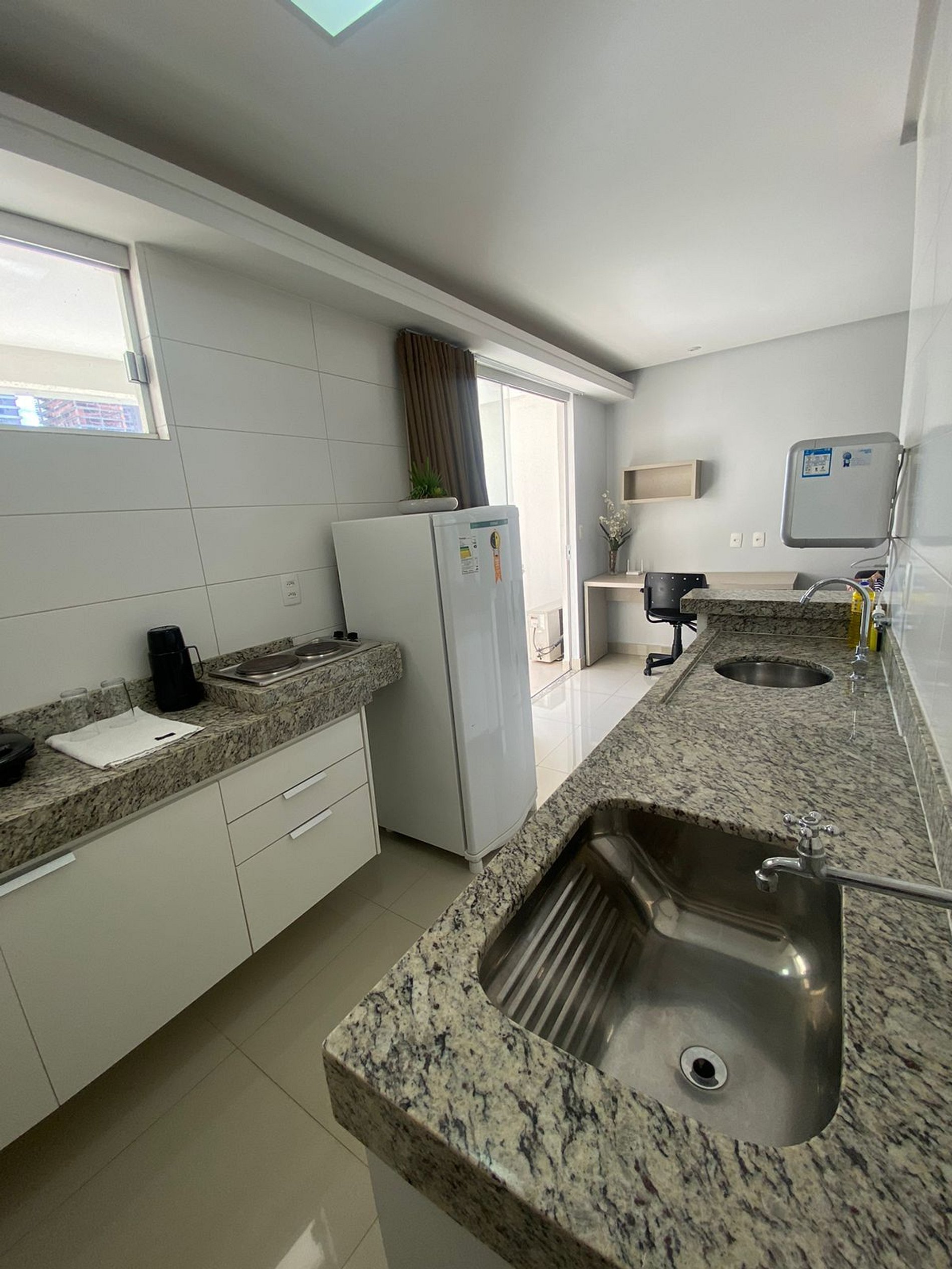 Flat aconchegante em excelente localização, com tudo acessível num passeio a pé. Possui ambientes integrados: sala e varanda com vista panorâmica; suíte com cama box casal; armários; banheiro com armários, espelho e blindex; cozinha completa e área de serviço. Além disso fornecemos roupas de cama e banho; ar condicionado; TV; sofá; acesso à internet via Wi-Fi; elevadores; recepção 24h. O bairro mistura centro comercial com prédios e casas residenciais, e isso o torna bastante agradável.