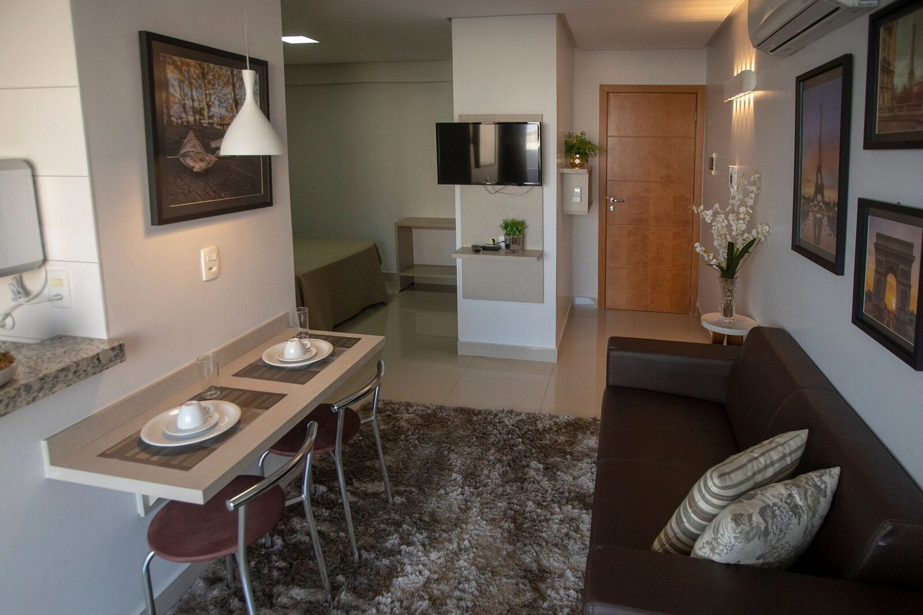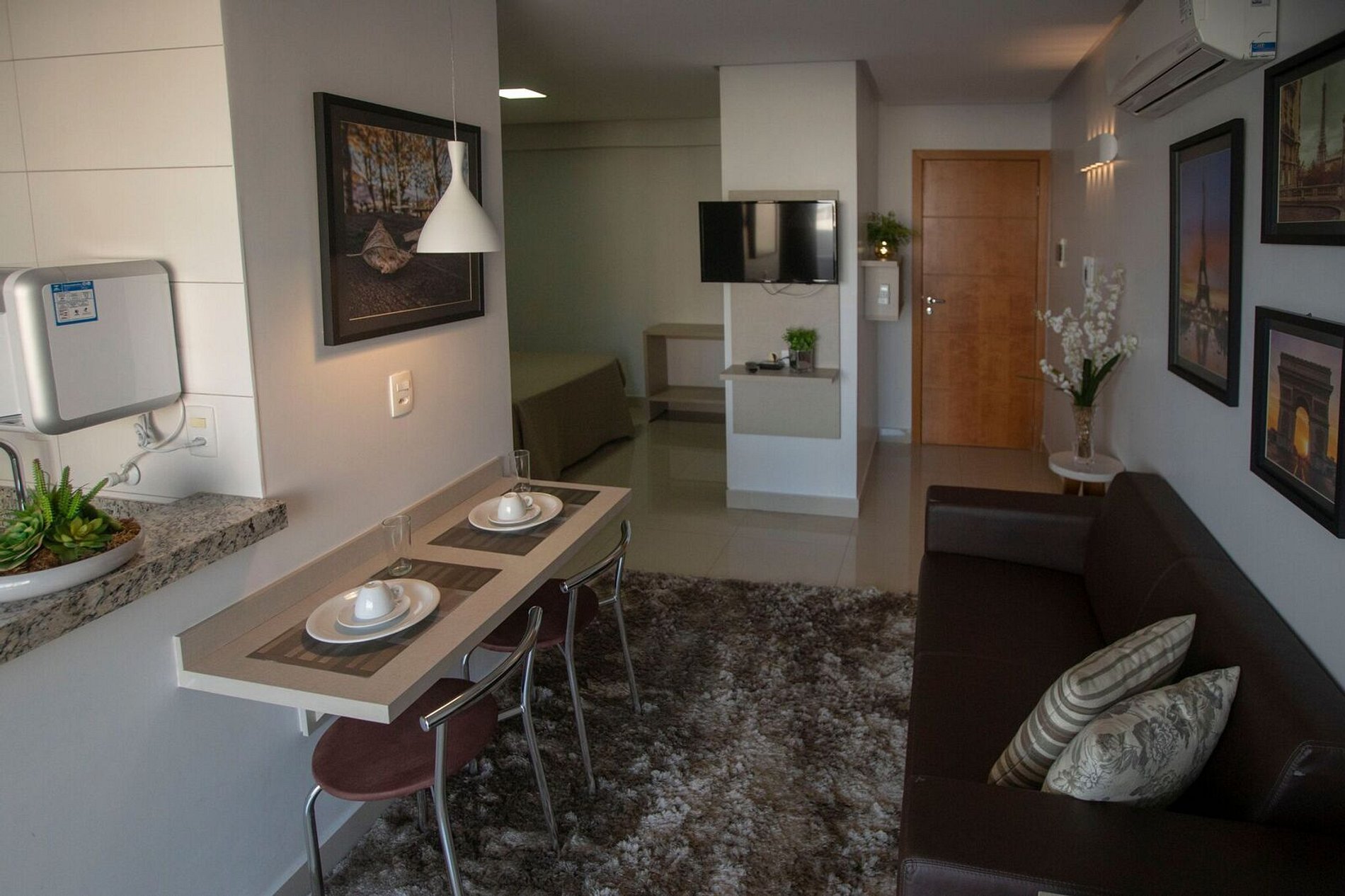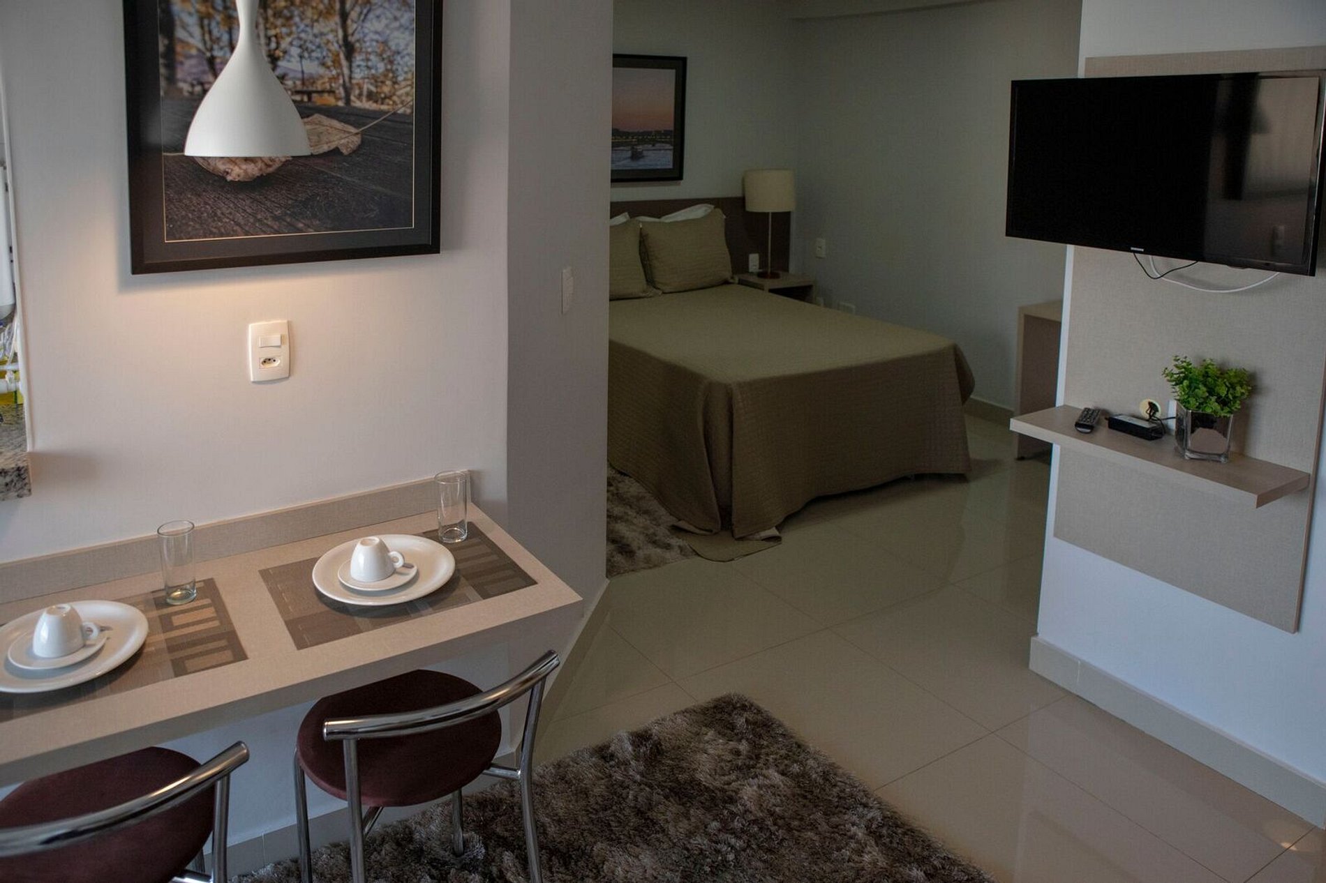 Flat aconchegante em excelente localização, com tudo acessível num passeio a pé. Possui ambientes integrados: sala e varanda com vista panorâmica; suíte com cama box casal; armários; banheiro com armários, espelho e blindex; cozinha completa e área de serviço. Além disso fornecemos roupas de cama e banho; ar condicionado; TV; sofá; acesso à internet via Wi-Fi; elevadores; recepção 24h. O bairro mistura centro comercial com prédios e casas residenciais, e isso o torna bastante agradável.